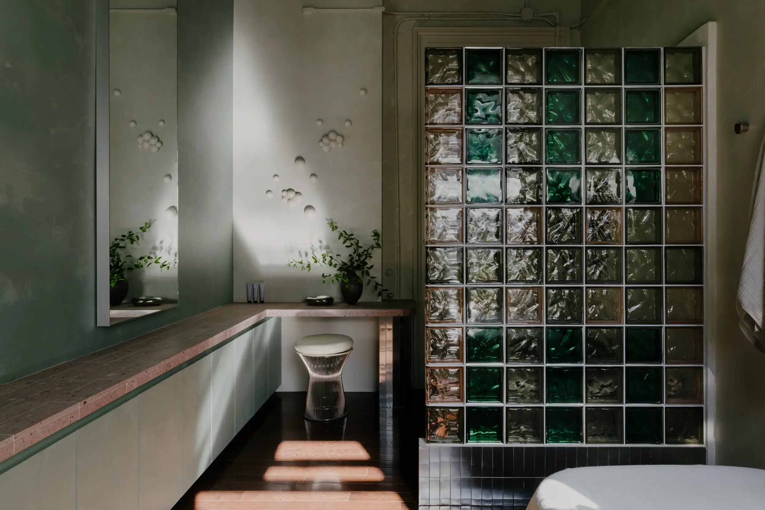 The distinctive aesthetic of Blue Nomad is the creation of Brooklyn-based Studio Tove, led by Silvana Vergara Tobin. Departing from conventional wellness design, the interiors feature a sophisticated palette of soft blue-greens and warm neutral tones. These are complemented by unique materials such as volcanic cantera stone, notable for its rare pink-purple hue. Reflective chrome accents, limewashed walls, and plaster finishes contribute to an atmosphere of fluidity and tranquility. Inspirations for this serene environment include the rich textures of Moroccan design and the contemplative interplay of light found in Peter Zumthor’s Therme Vals, resulting in a space that feels both grounded and ethereal.